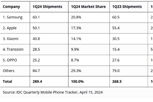 IDC a precizat că firma coreeană Samsung a reuşit să ia locul Apple ca principal furnizor global de smartphone-uri în primul trimestru din 2024, potrivit Financial Times.