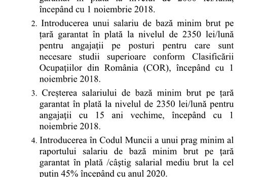 Potrivit documentului prezentat de ministrul Muncii, propunerea este de „Creştere a salariului de bază minim brut pe ţară garantat în plată la nivelul de 2080 de lei/lună, începând cu 1 noiembrie 2018”.