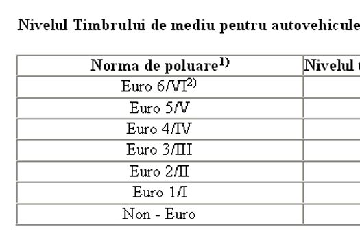 Guvernul a definitivat forma noii taxe auto, aplicată sub forma timbrului de mediu, cu o formulă de calcul diferită, care conduce la o creştere în medie de circa 10% a sumei de plată pentru maşinile Euro 4 şi Euro 3 şi o scădere cuprinsă între 60% şi 90% pentru maşinile Euro 2, Euro 1 şi non-euro.