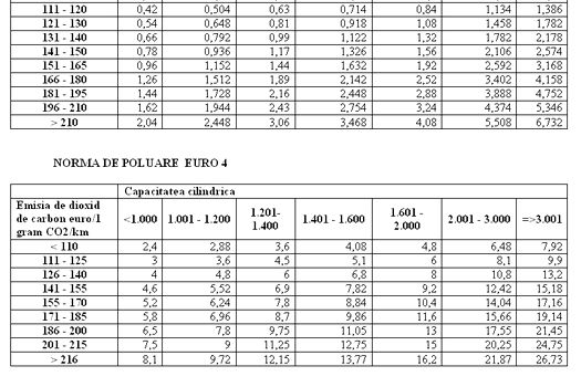 VW Golf 4 1390 cmc, 161 CO2, Euro 4 din 2002-de la 189 euro la 339 euro; Ford Focus 1560 cmc, 127 CO2, Euro 4 din 2004/2005/2006 -de la 293 euro la 336 euro;