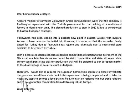 Manfred Weber a transmis, la începutul acestei luni, o scrisoare către reprezentanţi din conducerea Comisiei Europene în care spune că Volkswagen ar trebui să se orienteze să deschidă o fabrică în Bulgaria şi nu în Turcia.