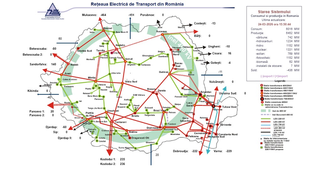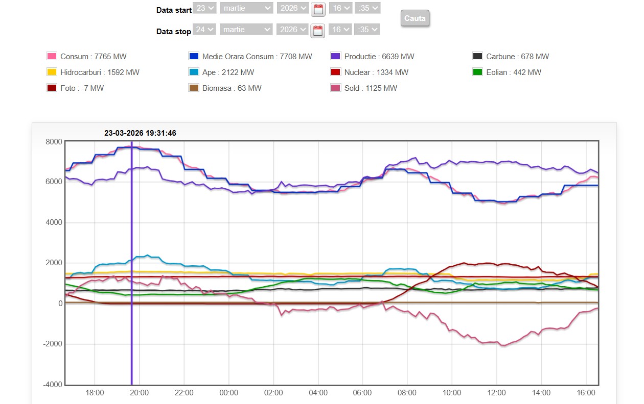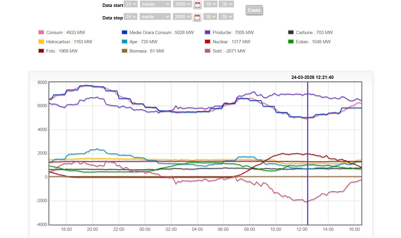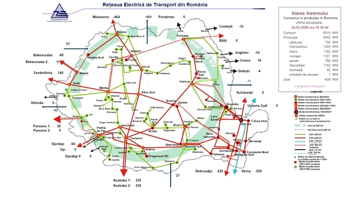 La polul opus, pe fondul creșterii producției din resurse solare și eoliene, marți, la ora 12:21 România genera mai multe energie decât consuma, astfel că exporta 2.071 MW, potrivit datelor în timp real ale Transelectrica.