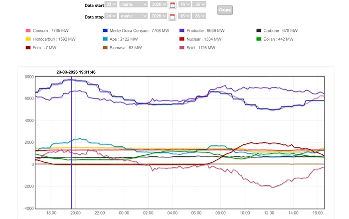 Dacă luni seara, la ora 19:30, România importa 1.125 MW ca să acopere consumul, iar cea mai mare producție, de 6.639 MW, venea din ape, respectiv 2.122 MW.