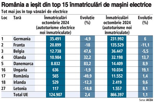 Spre comparaţie, în octombrie 2023, România era pe locul 13 la nivel european în cazul vânzărilor de electrice, dar piaţa era susţinută puternic de bonusul de 10.000 de euro. Acesta s-a redus în 2024 la 5.000 de euro.