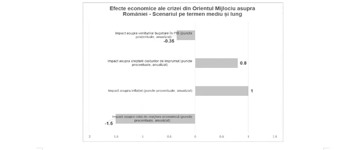 Pe termen mediu și lung (ipoteza unui șoc persistent, generat de durata și amplitudinea ridicate, plus 50% la prețul barilului de petrol), impactul asupra ratei de creștere economică ar putea fi de 1,5pp (față de scenariul baseline, fără criza din Orientul Mijlociu), asupra inflației de 1pp (efecte directe și indirecte plus presiunea pe deprecierea cursului), o creștere a costurilor de imprumut ale statului cu 60-80bps (0,6-0,8pp), o reducere a veniturilor bugetare în PIB de 0,25-0,35pp și o deteriorare mai puternică a balanței comerciale (față de scenariul pe termne scurt). (Infografic 2)