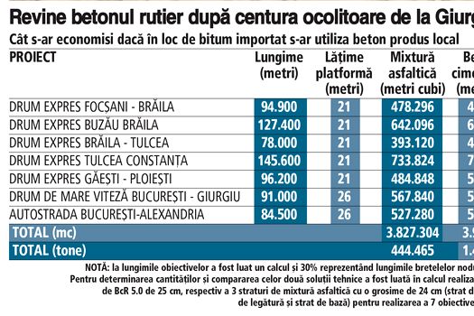 Potrivit calculelor Companiei Naţionale de Investiţii Rutiere, dacă pentru noile proiecte de infrastructură rutieră care totalizează peste 700 km s-ar utiliza ciment rutier, atunci economia realizată ar fi de aproape 500 mil. lei sau circa 100 mil. euro.