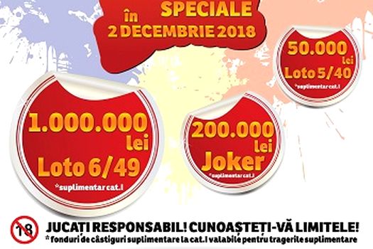 Pentru tragerea Loto 6/49 de joi, 20 decembrie, Loteria Română suplimentează fondul de câştiguri al categoriei I cu 100.000 de lei.