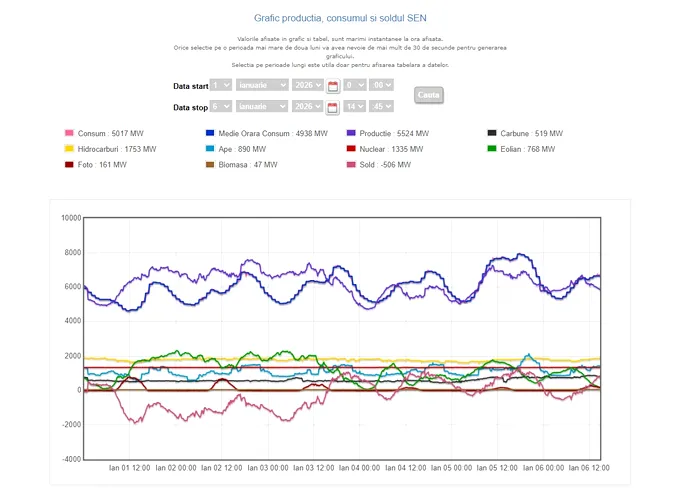 La ora menționată, consumul era de 6.647 MW, în timp de producția națională era de 5.898 MW, astfel că soldul de 748 MW reprezintă energia venită din import.
