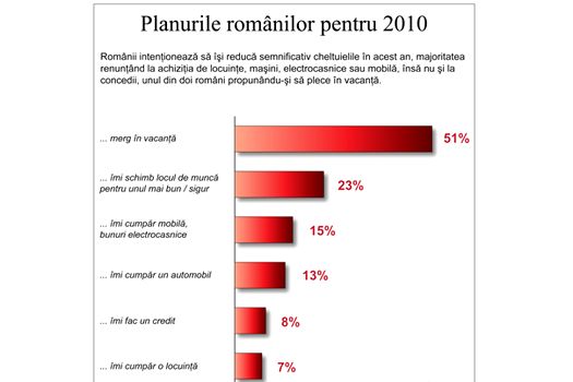„Românii din mediul urban privesc cu reţinere anul 2010 şi nu plănuiesc să facă prea multe investiţii majore. Astfel, pe lista lor de chetuieli pentru acest an nu apar locuinţele, precum nici cumpărarea unui automobil. Nici măcar electronicele, electrocasnicele sau mobila nu sunt de mare interes. Totuşi, chibzuinţa apare într-o măsură mai mică atunci când vine vorba de concediul de odihnă (…). Astfel, unul din doi români spun că nu îşi vor refuza un concediu de odihnă în acest an„, se arată în studiu.