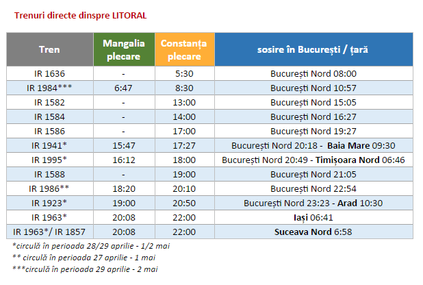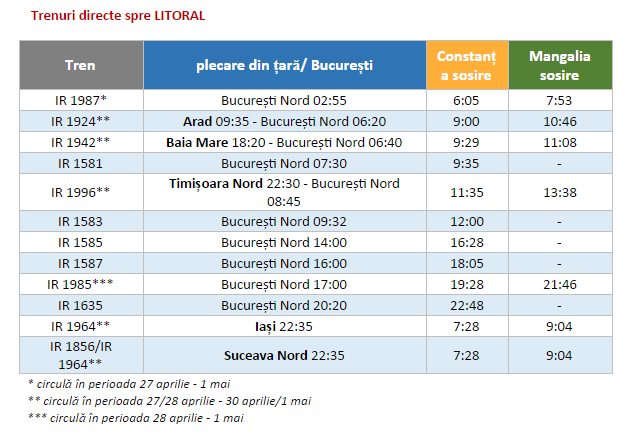 „Capitala şi oraşele din ţară Baia Mare, Beclean pe Someş, Braşov, Arad, Petroşani, Târgu Jiu, Craiova, Iaşi, Vaslui, Suceava Nord, Timişoara Nord, Drobeta Turnu Severin vor fi conectate cu litoralul prin trenuri directe, până la/de la Mangalia”, se arată într-un comunicat al CFR Călători.