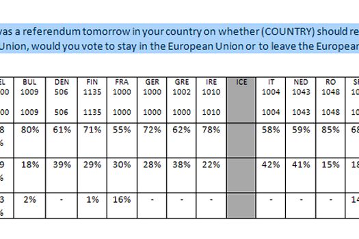 Astfel, la întrebarea „Dacă mâine s-ar organiza un referendum privind rămânerea sau ieşirea ţării dumneavoastră din UE, aţi vota pentru a rămâne sau pentru a ieşi din Uniunea Europeană?”, s-au obţinut următoarele rezultate: