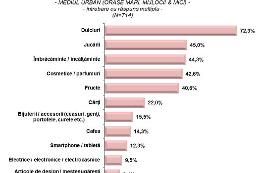 În ceea ce priveşte cadourile oferite, acestea vor fi multe şi diversificate, însă cele mai multe vor fi dulciurile, peste 80% dintre orăşeni declarând că intenţionează să le cumpere pentru a le oferi celor dragi.