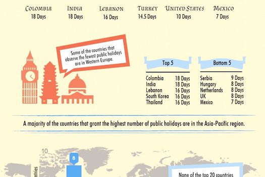 Columbia şi India conduc clasamentul ţărilor în funcţie de numărul de sărbători declarate zile libere, aceştia având 18 zile libere oferite de stat în fiecare ţară. Columbia e urmată de Libia, Coreea de Sud şi Thailanda (16 zile). Mexic se află la coada clasamentului, angajaţii având 7 zile libere de la stat, apropiaţi fiind şi cei din Regatul Unit şi Olanda, cu câte opt zile libere pe an.