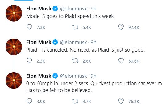 Duminică, Musk a scris pe Twitter, unde are un număr de adepţi peste 50 de milioane: „Plaid + este anulat. Nu este nevoie, deoarece Plaid este atât de bun”. El a adăugat: „De la 0 la 60 mph în mai puţin de 2 secunde. Cea mai rapidă maşină de serie de orice fel. Trebuie să simţi pentru a crede”.