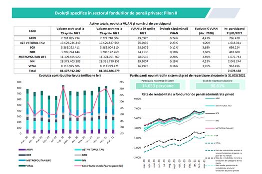 Cele şapte fonduri de pensii private Pilon II aveau la 29 aprilie 2021, ultima zi de tranzacţionare din aprilie, active totale de 81,4 mld. lei, record istoric, în creştere cu 6,3 miliarde de lei faţă de finele anului 2020, arată datele agregate de ZF din cel mai recent raport săptămânal al Autorităţii de Supraveghere Financiară.