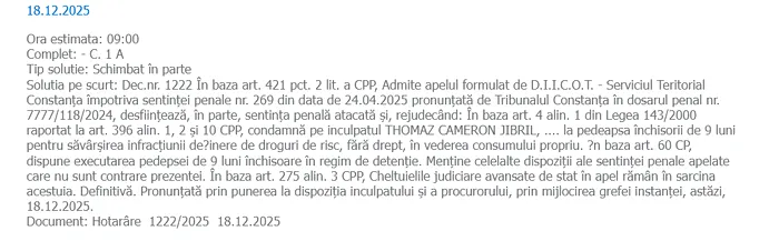 Conform minutei instanței, Curtea de Apel a decis condamnarea artistului la 9 luni de închisoare cu executare, în baza Legii nr. 143/2000, pentru infracțiunea de deținere de droguri de risc, fără drept, în vederea consumului propriu, anunță Cancan.