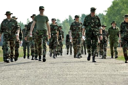 Trăgătorii îşi petrec weekendurile efectuând manevre în pădure sau într-o tabără de antrenament militar de la Pabrade, la nord de Vilnius.