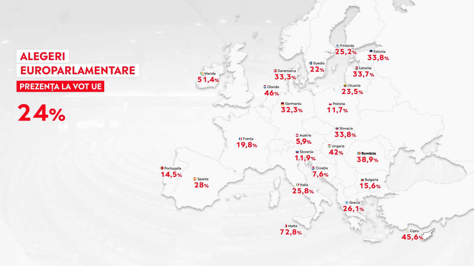 - Între 23:15 şi 23:30, Parlamentul European va comunica o nouă proiecţie a hemiciclului pe baza rezultatelor provizorii în douăzeci şi patru de ţări – adică din numărări parţiale sau finalizate –, estimări în Polonia şi Italia, unde. secţiile de votare se vor fi închise la ora 23:00, iar scrutinurile înainte de votare pentru Belgia, unde votul va fi încă în curs;