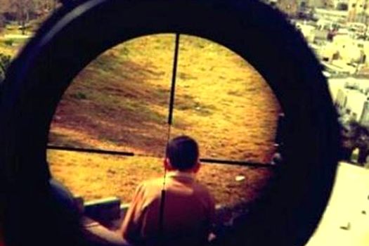 În fotografie apare un băiat întors cu spatele, privit printr-o lunetă care ţinteşte foarte aproape de capul său. Arma stã la o fereastrã în direcţia a ceea ce pare un cartier sau oraş palestinian.