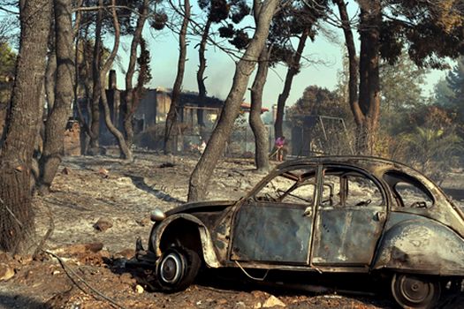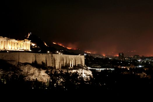 Intensificate de rafale de vânt foarte puternice, flăcările au parcurs circa 30 de kilometri spre est, atingând primele locuinţe la Mont Penteli, ultima barieră înaintea cartierelor mărginaşe ale capitalei.