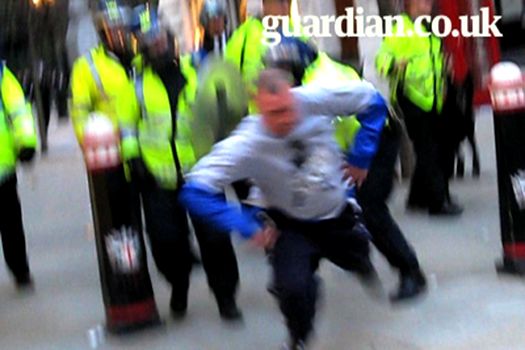 Câţiva ofiţeri, unii însoţiţi de câini şi aflaţi la mică distanţă în spatele lui, încercau să îl determine să se grăbească, în timp ce un poliţist pare să îl lovească din spate cu un baston.