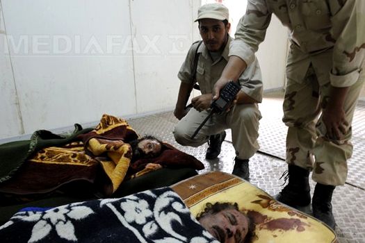 În interior, spectacolul este sordid: într-o atmosferă glacială, pe podeaua metalică, zac două cadavre rigide şi galbene acoperite de pete de sânge uscat, Muammar Kadhafi şi fiul său Mutassim, unul lângă altul pe saltele murdare, acoperite cu o pătură colorată care ascunde eventualele mutilări.