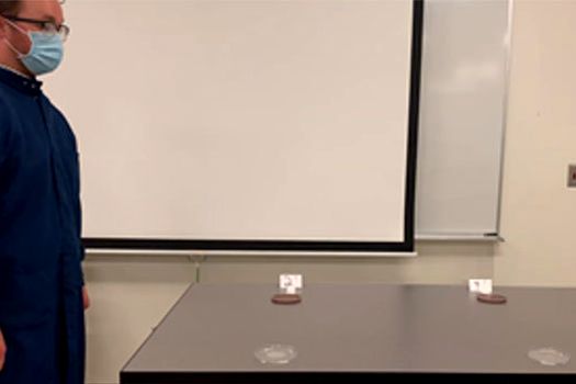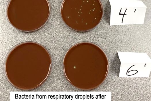 Apoi, acesta a demonstrat şi rolul menţinerii distanţării fizice. Davis a plasat 3 probe de culturi bacteriene la distanţe de aproximativ 0,5 metri, 1 metru şi 1,5 metri. A tuşit cu putere timp de 15 secunde, orientat cu faţa spre recipientele respective. Cercetătorul a repetat procedeul cu şi fără a purta masca de protecţie. Potrivit rezultatelor sale, masca a blocat din nou aproape toate particulele respiratorii.