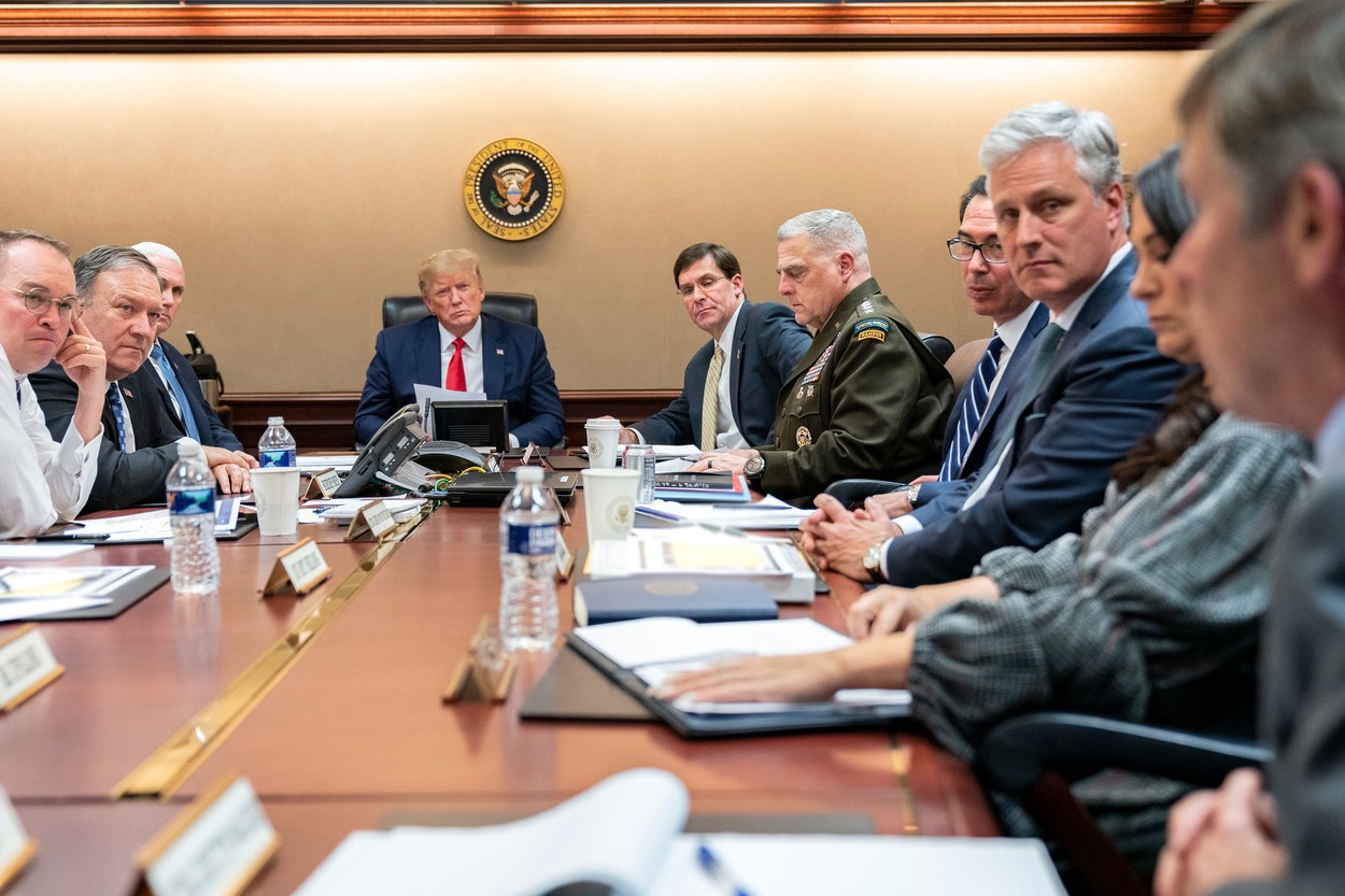 Trump, Pence, Secretarul de Stat Mike Pompeo, Steve Mnuchin, Secretarul Apărării Mark Esper, Consilierul în Securitate Naţională Robert O’Brien, generalul Mark Milley, precum şi directorul Biroului Naţional de Informaţii Joseph Maguire au participat la şedinţa convocată în „Situation Room”, scrie CNN.