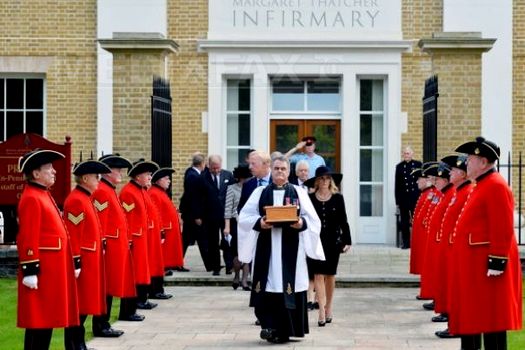 Douăsprezece persoane găzduite în instituţie, purtând cunoscuta redignotă de culoarea roşie, au format o gardă de onoare, iar copiii fostului premier, Mark şi Carol Thatcher, au depus fiecare câte un trandafir roşu lângă urnă.