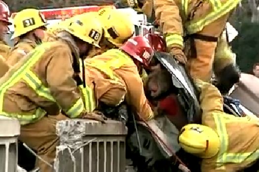 Echipa de salvare a folosit un motostivuitor de pe cealaltă parte a podului, pentru a opri căderea maşinii agăţată de parapet.