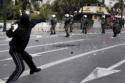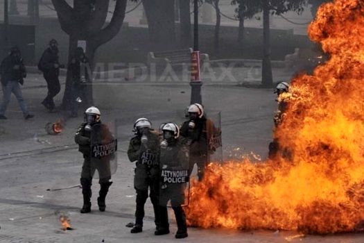 Forţele de ordine, care au format un cordon în faţa Ministerului de Finanţe, au lansat gaze lacrimogene şi iritante pentru a respinge tinerii, care aruncau în ele cu diverse proiectile.