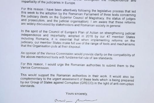 „O opinie a Comisiei de la Veneţia ar conferi claritate privind compatibilitatea textelor menţionate mai sus cu standardele fundamentale ale statului de drept. Din acest motiv, aş îndemna autorităţile din România să le transmită Comisiei Veneţia. Acest lucru ar fi o formă de susţinere pentru activitatea autorităţilor române. De asemenea, acest lucru ar fi complementar pentru evaluarea urgentă a acestor texte pregătită de Grupul Statelor împotriva Corupţiei (GRECO) la capitolul standardelor anticorupţie”, încheie Thorbjørn Jagland.
