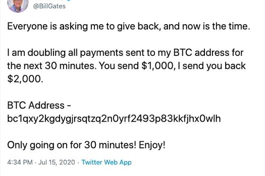 Mesajul postat de hackeri pe contul lui Bill Gates arăta că „Toată lumea îmi cere să dau înapoi. Acum este momentul. Dublez toate plăţile făcute în contul meu de bitcoin pentru următoarele 30 de minute. Trimiţi 1.000 de dolari şi eu îţi trimit înapoi 2.000”.