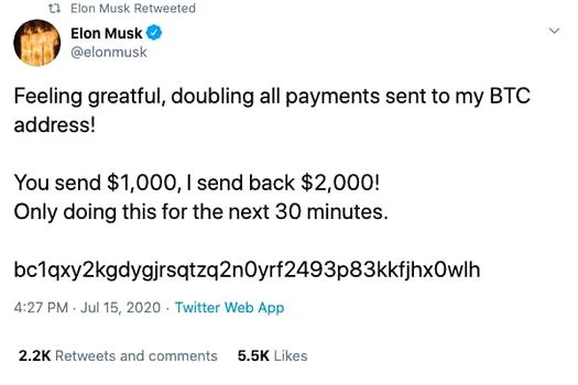 „Dacă trimiteţi 1.000 de dolari, trimit înapoi 2.000 $!” în următoarele 30 de minute, spunea tweetul postate pe contul lui Elon Musk.