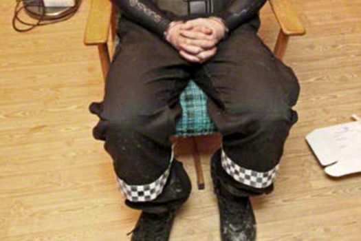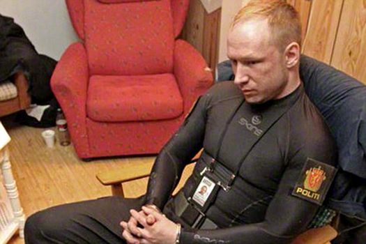 Criminalul poartă o ţinută asemănătoare uniformelor de poliţie, pe care a folosit-o pentru a păcăli personalul de securitate şi a ajunge pe insula Utoeya. Încălţămintea lui Breivik este murdară de noroi, după urmărirea victimelor pe insulă.