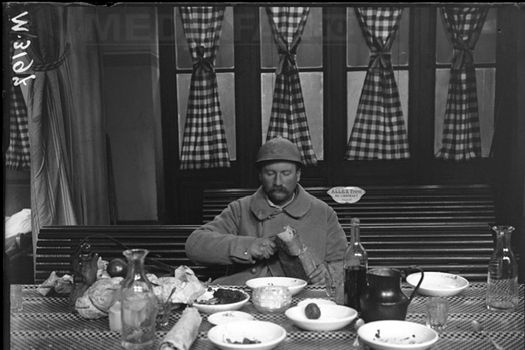 Un soldat aflat în permisie se bucură de o masă îndestulătoare, în Gare de l’Est, Paris.