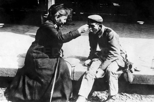 O asistentă de la Crucea Roşie din Franţa hrăneşte un soldat rănit.