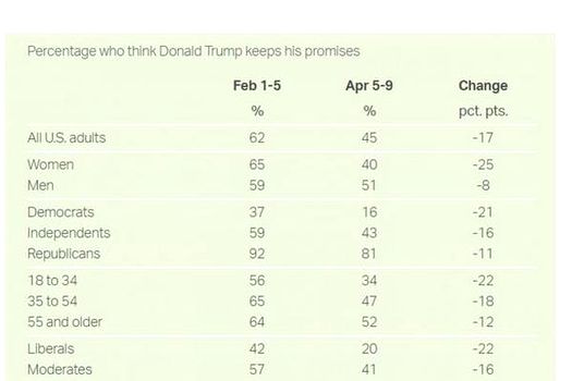 Sondajul arată, totodată, o scădere de 11 procente şi în cazul încrederii în republicani şi de nouă procente în cazul încrederii în conservatori. Per total, faţă de sondajul anterior, realizat în perioada 1-5 februarie, procentul americanilor care cred că Trump poate înfăptui marea schimbare de care are nevoie America a scăzut de la 53% la 46% şi de la 42% la 36% în cazul celor care cred că Trump este onest şi demn de încredere, scrie Gândul, citând sondajul publicat de The Washington Post.