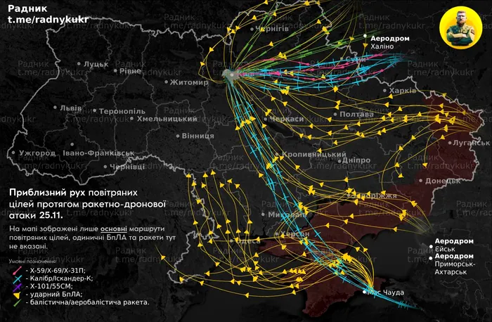 Imaginea, realizată pe baza datelor forțelor de apărare aeriană ale Ucrainei, arată traseele aproximative ale diferitelor tipuri de rachete și drone folosite în atac. Săgețile galbene, care marchează rutele dronelor de atac, pornesc din zona de est a Crimeei – în special din proximitatea capului Chauda și a aerodromului Primorsko-Ahtarsk – traversează Marea Neagră și sudul Ucrainei, apoi se îndreaptă spre vest, spre zona de frontieră cu România.