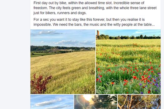 „Prima zi cu bicicleta, în intervalul de timp permis. Sentiment incredibil de libertate. Oraşul este verde şi respiră. Întreaga stradă cu trei benzi este doar pentru biciclişti, alergători şi câini”, a scris un român stabilit în Madrid despre prima zi în care li s-a permis să facă sport în aer liber.