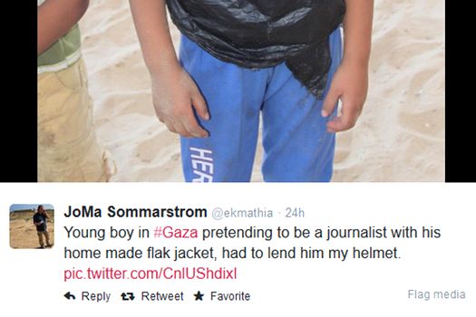 ”Băieţel din #Gaza care pretinde că este jurnalist, cu vesta lui antiglonţ făcută în casă, a trebuit să îi împrumut casca mea”, a scris reporterul pe Twitter.