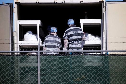 Deţinuţii din El Paso,Texas încarcă în camioane frigorifice zeci de cadavre ale celor decedaţi de coronavirus. Imaginile au fost surprinse în spatele unei morgi.