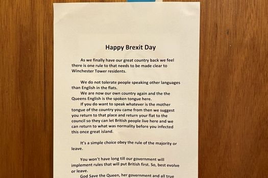 „În sfârşit ne-am luat ţara înapoi (…) nu tolerăm în apartamente oameni care vorbesc alte limbi decât engleza”, se arată în anunţul lipit pe ieşirile uşilor de urgenţă ale clădirii Winchester Tower, bloc cu 95 de apartamente, destinat unor chiriaşi cu vârsta de peste 55 de ani, informează Eastern Daily Press.