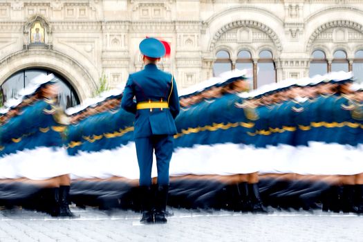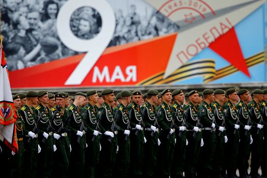 Parada a început cu un marş cu steaguri, făcut de batalionul gărzilor de onoare ale Regimentului Preobrazhensky, desfăşurat în Piaţa Roşie