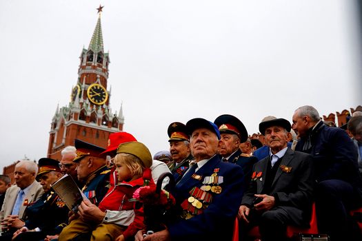 Preşedintele rus Vladimir Putin, veterani de război şi mai mulţi invitaţi, au urmărit evenimentul de la tribuna centrală din Piaţa Roşie.