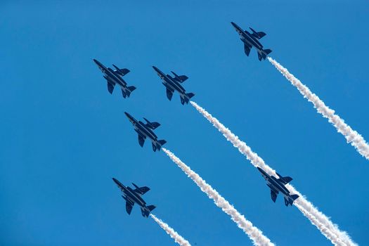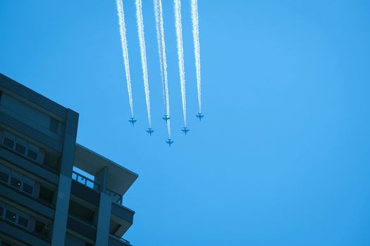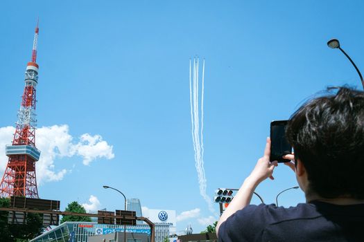 Ca o echipă de şase, avioanele T-4, s-au strecurat pe cerul albastru, lipsist de nori, din capitala Japoniei. Medicii şi asistentele de la mai multe spitale au asistat la spectacol de pe acoperişuri.