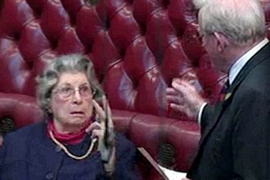În acel moment, Lady Trumpington îi aruncă o privire dispreţuitoare şi îi arată două degete, un gest considerat ofensator şi obscen în Marea Britanie, după care revine la documentele sale.