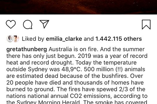 „Australia este în flăcări. Iar vara acolo abia a început. 2019 a fost un an al recordurilor în ceea ce priveşte temperaturile şi nivelul de uscăciune. Astăzi, temperatura în Sydney a fost de 48,9 grade Celsius. Se estimează că au murit 500 de milioane (!!) de animale în urma incendiilor de vegetaţie. Peste 20 de oameni au murit şi mii de case au ars complet. Incendiile au generat (două treimi) din emisiile naţionale anuale de dioxid de carbon, potrivit Sydney Morning Herald. Fumul a acoperit gheţarii din îndepărtata Noua Zeelandă, provocând încălzirea şi topirea lor mai rapidă. Şi totuşi. Nimic nu a determinat vreo acţiune politică. Pentru că nici acum nu reuşim să facem legătura dintre criza climatului şi evenimentele meteorologice extreme în creştere şi dezastrele naturale precum #AustraliaFires (Australiaincendii). Acest lucru trebuie să se schimbe. Şi trebuie să se schimbe acum”, a scris Greta Thunberg.