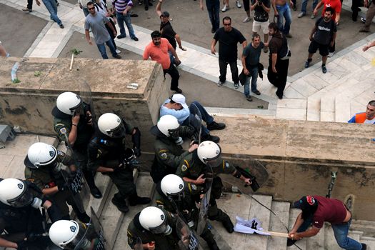 Greviştii urmau să manifesteze în centrul capitalei până la Parlament, unde s-au discutat în comisie măsurile de austeritate cerute de Uniunea Europeană şi Fondul Monetar Internaţional.