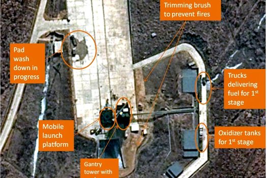 Imaginile arată că rampa de lansare a fost amplasată, conform 38 North. Echipamentele conectate la turn, în timp ce mai mulţi oameni sunt văzuţi pe rampă.